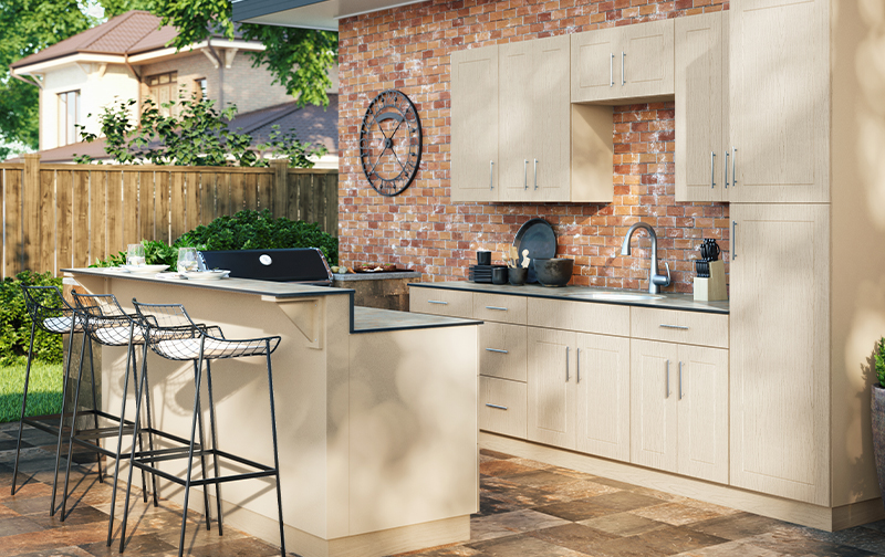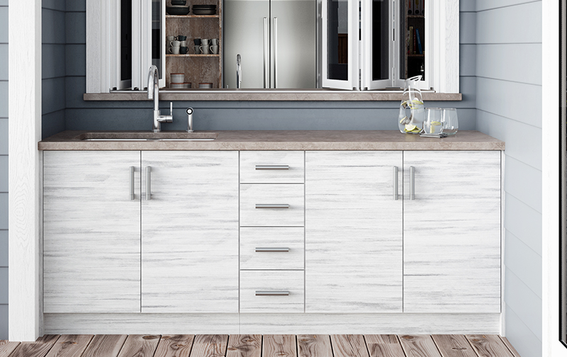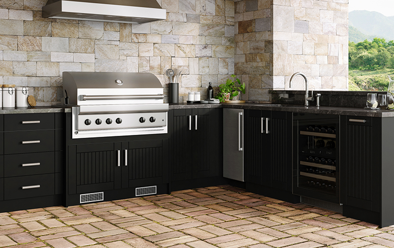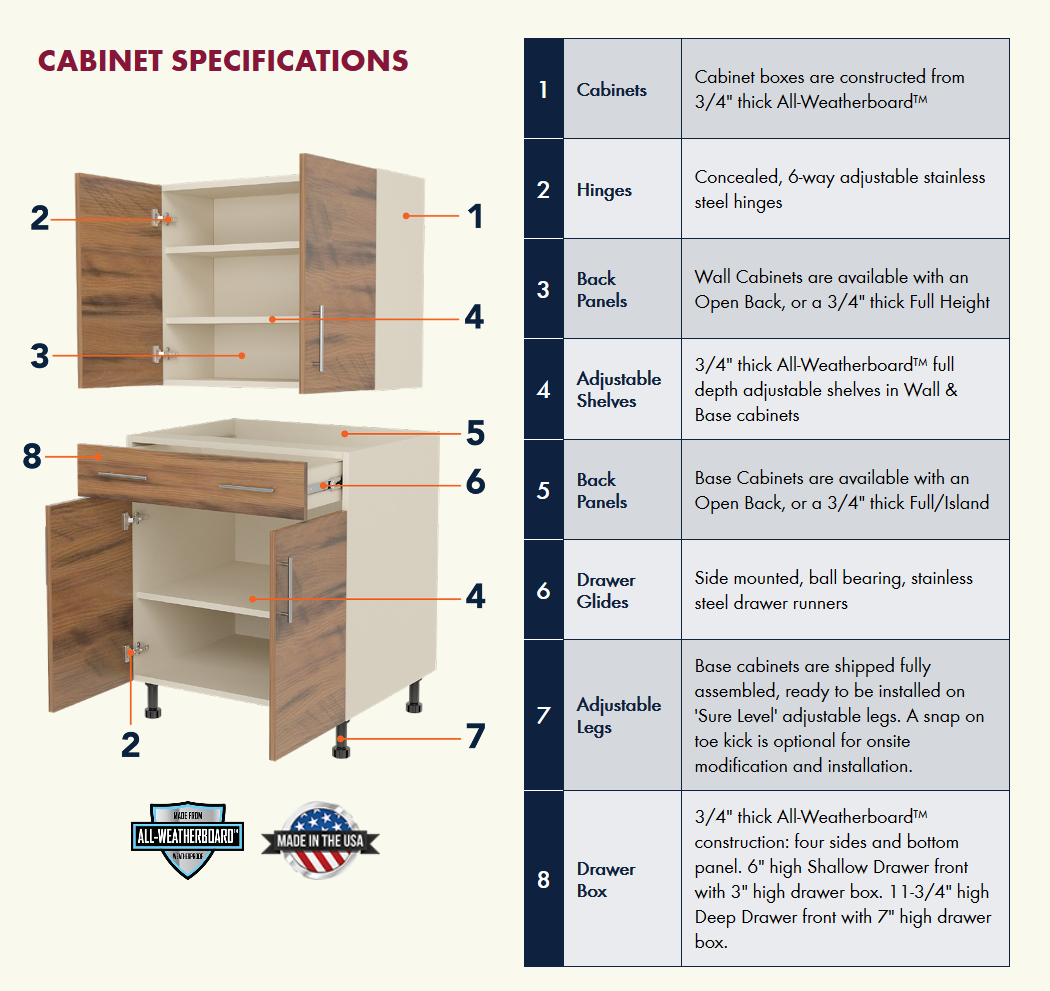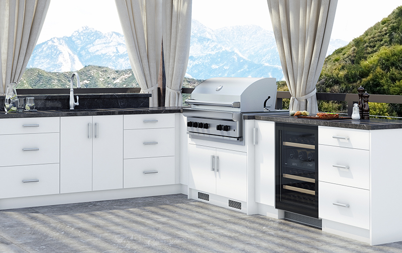 With the desire to spend more quality time outdoors, WeatherStrong Outdoor Cabinetry is designed with your lifestyle in mind. Our cabinets are manufactured in the U.S.A. with a 3⁄4" All‑Weatherboard™ to stand up to the harsh elements Mother Nature can send your way. Pounding rain, hot summers, and cold snowy winters are no problem. WeatherStrong cabinets are tough enough to take it. WeatherStrong offers seven different doorstyles and fourteen color options to suit any style! All decorative hardware, hinges and drawer runners are stainless steel, top rated for outdoor use. All cabinets are factory built in a variety of sizes and options, making WeatherStrong perfect for any outdoor, wet room or garage application. WeatherStrong Ships in 7 to 10 Days.